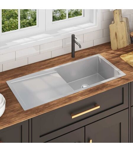 Profitez de l'avantage de cet évier de cuisine au design contemporain épuré. La vasque avec égouttoir en finition soyeuse et satinée suintera la classe et la sophistication, qui s'adaptera à n'importe quel décor de cuisine ! Combinant le meilleur de la fonction et du design, cet évier est fabriqué en acier inoxydable fait main de haute qualité avec une peinture anti-condensation, résistant à la moisissure, sans plomb et résistant à la corrosion. C'est l'insonorisation avec les coussinets de réduction du son. De plus, l'évier avec une conception unique de cadre en X facilite un écoulement rapide, empêchant l'eau stagnante au fond de l'évier. L'évier peut être installé sous le comptoir, encastré et suspendu et vous pouvez l'installer comme vous le souhaitez. Couleur : argenté Matériau : acier inoxydable avec finition brossée Dimensions totales : 100 x 44 x 20 cm (L x l x P) Épaisseur supérieure : 2,5 mm Qualité alimentaire Avec un égouttoir Comprend des coussins d'insonorisation Sans ...