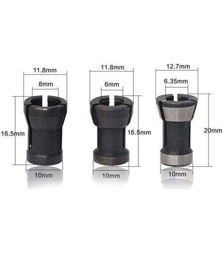 【Matériel】Tête de mandrin de fraise à bois de haute précision. Acier rapide adopté, a une bonne flexibilité et résistance à l'usure. 【Pratique et efficace】Serrage portable, haute précision, serré et stable, améliore l'efficacité du travail. 【Application】Convient pour machine de gravure, routeur à bois, machine de gravure de coupe, etc. 【Taille】8mm/6.35mm/6mm(0.31 pouce/0.25 pouce/0.24 pouce). 【Contenu de l'emballage】 6 PCS * Pinces de toupie (2 pièces par taille) Spécifications : Matériel : HSS Taille de la pince de toupie : 8 mm / 6,35 mm / 6 mm (0,31 pouce / 0,25 pouce / 0,24 pouce). Remarque : en raison de la mesure manuelle, il peut y avoir une erreur de 0 à 3 mm. La couleur de l'image peut ne pas être complètement la même avec la article réel en raison de la méthode de prise de vue et du dispositif d'affichage, Assurez-vous que cela ne vous dérange pas avant d'acheter, merci ! Contenu de l'emballage : 2 pinces de défonceuse 6 mm 2 pinces de défonceuse 6,35 mm Pinces de défonceuse ...