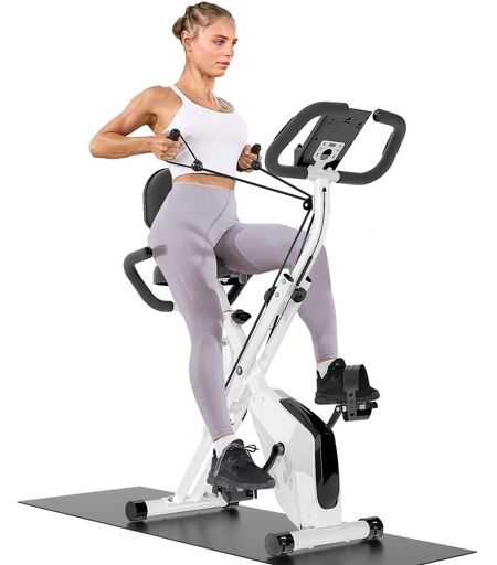 Vélo d'appartement 4-en-1 polyvalent offrant un entraînement complet (cardio, renforcement musculaire, récupération) grâce à sa résistance magnétique silencieuse 8 niveaux ajustable progressivement. Équipé d'un écran LCD pour suivre vitesse, distance, calories, fréquence cardiaque et odomètre. Design compact pliable avec roulettes pour un rangement facile. Selle confortable rembourrée, guidon ergonomique et pédales antidérapantes. Idéal pour débutants et sportifs exigeants. ...