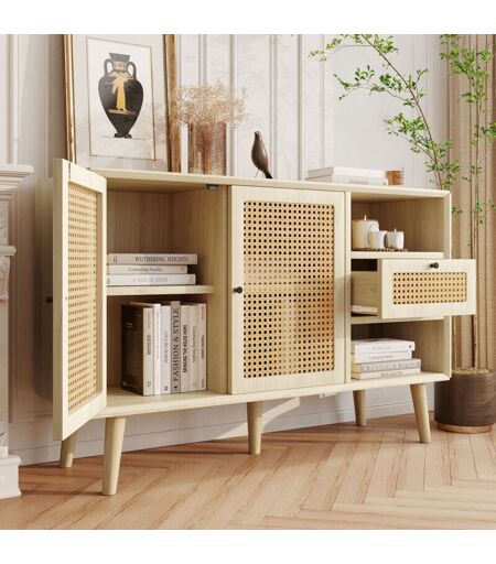 MODFU Buffet, buffet et armoire 120x40x78cm avec 1 tiroir 2 portes, commode, design en rotin, étagères réglables, mdf, couleur chêne
