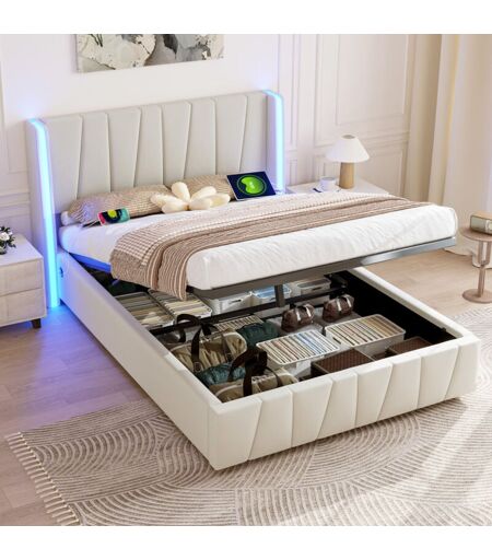 Modfu - Lit coffre adulte, velours, lit double led, sans matelas, usb, beige, 140x200cm