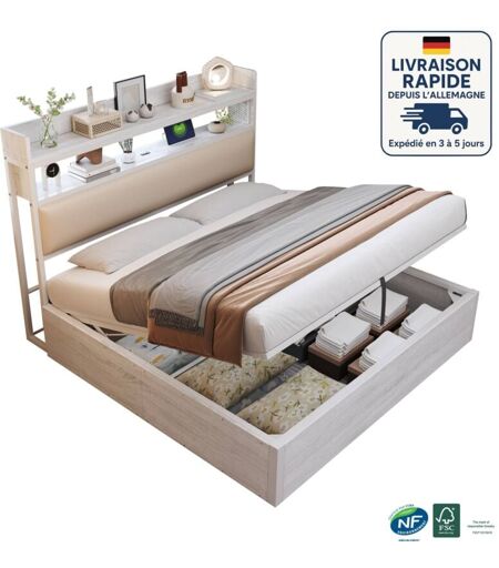 Caractéristiques principales Design de rangement intelligent : Ce lit dispose d'un grand espace de rangement sous le lit, facilement accessible grâce au système hydraulique, parfait pour ranger la literie, les vêtements et autres objets essentiels. Tête de lit confortable avec rangement : Une tête de lit rembourrée offre un confort maximal pour la lecture ou la télévision et comprend un espace de rangement pour livres, décorations et accessoires de nuit. Design rétro bois et métal : Une combinaison élégante de motifs bois vintage et de structure métallique industrielle apporte charme et durabilité à votre chambre. Ports de charge USB : Ports USB intégrés des deux côtés de la tête de lit pour recharger facilement smartphones, tablettes et autres appareils sans besoin de prises supplémentaires. Cadre stable et silencieux : Cadre en métal haute résistance et lattes en bois pour un soutien durable, stable et silencieux, sans grincements pendant la nuit. Description Transformez votre ...