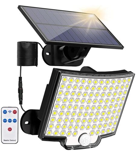 Niveau d'étanchéité: IP65 Matériau du corps: ABS+PC Source d'alimentation: Solaire Tension: 3.7V Source de lumière: Ampoules LED Perles LED: 106 pièces Capacité de la batterie: 3000 mAh Poids: 0.5kg Panneau solaire divisé: par rapport aux lampes solaires conventionnelles, nous séparons le panneau solaire et le corps principal de la lumière, vous pouvez installer le panneau solaire dans un endroit ensoleillé avec le câble étanche de 5 m fourni pour stocker beaucoup plus d'électricité pendant la journée et produire. lumière plus longue et plus brillante la nuit. Éclairage de haute qualité: avec 106 lampes solaires LED avec un angle de détection et d'éclairage de 120 °, couvre beaucoup plus de zone d'éclairage, offre un éclairage super lumineux pour une large zone. Cela crée un environnement lumineux et sûr pour les passants, même la nuit. Capteur de mouvement et capteur de lumière: le système de détection est une combinaison de capteur de lumière et de capteur de mouvement, le capteur ...