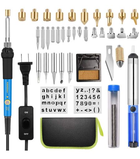 Product description wood burning kit woodburning tool with soldering iron for all types of needs of pyrography artists, hobbyists, crafters and fine artists. Nice starter kit for woodburning, leather crafting, soldering, stamping, paper crafting, hot knife cutting, pattern transferring, embossing, stencil cutting, calligraphy, personalizing and so on. Procuct Specifications Material: Plastic + Brass + Steel Input Supply: AC110V, 50-60Hz Power:15-60W Operating Temperature:0-40°C Temperature Range: 200°C-450°C(392°F-842°F) How to Use 1.Choose a tip you like and install it to the device 2.Connect the device to a 110V power outlet 3.Wait 3-5 minutes for it to heat up 4.Start drawing on the wood surface with it 5.A wide variety of patterns can be created with the tips and stencils supplied [Package Includes]: 1 x Wood burning pen 25 x wood burning and soldering tips 5 x iron heads 1 x wood burning converter head replacement 1 x mini stand, 1 x solder sucker 1 x solder wire 2x ...