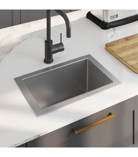 Profitez de l'avantage de notre évier haut de gamme au design contemporain épuré. Le bol rectangulaire à finition soyeuse et satinée suintera la classe et la sophistication, qui s'adaptera à n'importe quel décor de cuisine ! Combinant le meilleur de la fonction et de la conception, cet évier à vasque unique est conçu en acier inoxydable fait à la main de haute qualité en peinture anti-condensation, résistante à la moisissure, sans plomb et résistante à la corrosion. Il est insonorisé avec les coussins d'insonorisation. De plus, le bol avec un design à canal en X unique facilite l'écoulement rapide, empêchant l'eau stagnante au fond du bassin. Le filtre à déchets haut de gamme est inclus pour séparer les déchets et drainer l'eau sans difficulté. L'évier est facile à assembler. Il peut être installé sous le comptoir, encastré et suspendu et vous pouvez l'avoir comme vous le souhaitez. Couleur : argenté Matériau : acier inoxydable avec finition brossée Dimensions totales : 44 x 29 x 20 ...