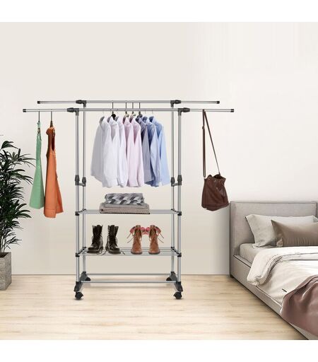 Bonne stabilité : fabriqué en acier inoxydable de haute qualité, relié par des pièces en plastique PP, solide, stable, résistant à la corrosion, grande capacité de charge : 15 kg Hauteur réglable : hauteur réglable de 70 cm à 150 cm, perche télescopique réglable de 90 à 144 cm, largeur 78 cm. 2 tringles à suspendre pour suspendre plus de vêtements Roulettes pivotantes : équipées de 4 roulettes en plastique pour un déplacement facile. 2 d'entre eux sont équipés de freins pour éviter tout glissement accidentel Étagères pratiques : Equipées de 2 étagères pour ranger des chaussures ou des objets nécessaires, la hauteur entre les étagères est réglable selon vos besoins. Montage et démontage rapides et faciles, gain de place Polyvalence : ce produit est conçu pour ranger des vêtements, des sacs, des serviettes et plus encore. Convient non seulement au salon, à la chambre ou au studio de cinéma, mais également au séchage des vêtements à l'extérieur ...