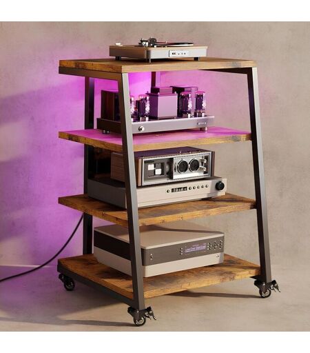 XIIW Meuble HiFi à 4 Etagères en Bois et Acier avec roulettes, Support pour Platine Vinyle, Meuble Audio/Vidéo, Avec bande LED et Steckdosenleisten,