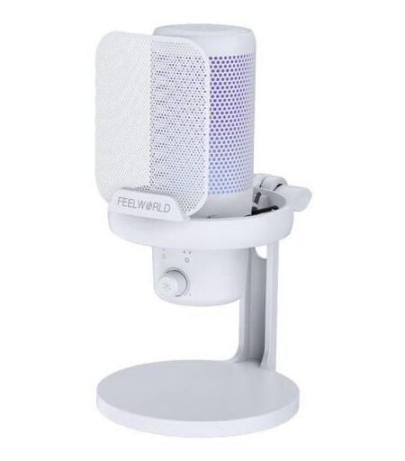Microphone de jeu à condensateur USB FEELWORLD VM1 avec réduction du bruit à un bouton, cardioïde directionnel, effet d'éclairage RVB, support de bureau (couleur : blanc) - VM1-AS