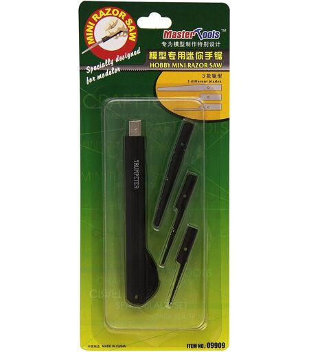 pMasterTools by Trumpeter - Hobby Mini Razor SawTool for making accurate cuts in a variety of materialsThis contains a handle in black ABS plstic, and a plastic lock, one metal bracket, 3 different style metal saw bladesBlades are SHARP. Keep away from childrenp ...