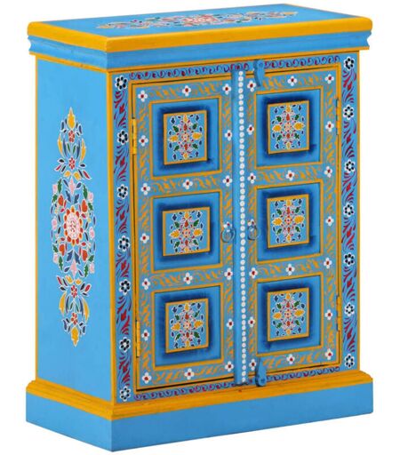 Ce buffet unique ajoutera une touche de couleur qui rendra le décor de votre salon vraiment joli. Le buffet est fabriqué à la main en bois de manguier qui est à la fois durable et beau et l'artisanat ajoute à son style rétro spectaculaire. Chaque étape du processus est réalisée avec le plus grand soin, que ce soit le polissage, la peinture ou le laquage. Le buffet comporte de nombreux détails décoratifs peints à la main, ce qui crée un effet chaleureux et riche. Ce buffet a une grande armoire avec une étagère pour garder toutes sortes de petits objets organisés et à portée de main et deux verrous pour garder les portes fermées. L'article est déjà assemblé ; aucun assemblage n'est requis. Couleur : multicolore (base turquoise) Matériau : bois de manguier massif Dimensions : 60 x 30 x 78 cm (l x P x H) Avec un riche détail décoratif peint à la main Article poli, peint et laqué Article fait à la main Avec une grande armoire avec 2 portes Aucun assemblage n'est requis ATTENTION : afin ...