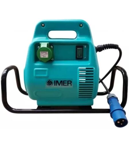 Convertisseur haute fréquence monophasé ST0488 version luge, protection thermique pour les gros travaux de vibration. Disjoncteur magnétothermique général avec système de réarmement automatique, incorporé dans le boîtier, pour une protection performante contre les surcharges de circuit secondaire. Caractéristiques : Marque: IMER Tension : 230 V Mono Fréquence : 50 Hz Intensité primaire : 6.1 A Tension secondaire : 42 V 3~ Fréquence secondaire : 200 Hz Intensité secondaire : 14 A / 1 prise Puissance : 1 KVA Dim. Châssis L x l x H : 29 x 20 x 35 cm Montage d’aiguilles en simultané : 1 Ø 38 mm ou 1 Ø 50 mm Poids : 17.5 Kg ...