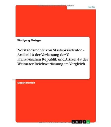 Wolfgang Metzger Notstandsrechte Von Staatspräsidenten - Artikel 16 Der Verfassung Der V. Französischen Republik Und Artikel 48 Der Weimarer Reichsverfassung Im Vergleich