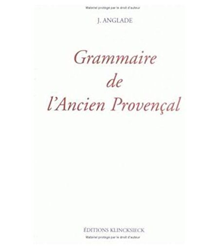 Joseph Anglade Grammaire De L'Ancien Proven Al : Phonétique Et Morphologie Ou Ancienne Langue D'Oc
