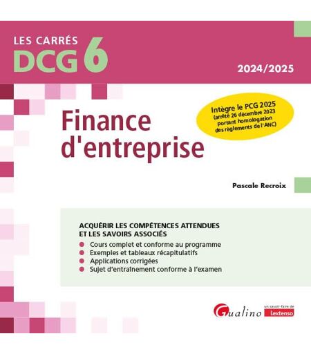 Binding : paperback, Label : DCG 6 - Finance d'entreprise : Intègre le PCG 2025 (arrêté 26 décembre 2023 portant homologation des règlements de l'ANC), Format : big_book, medium : paperback, numberOfPages : 384, publicationDate : 2024-08-13, languages : french, ISBN : 2297269455 ...