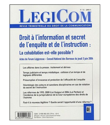 Michel Bénichou Légicom, N° 33. Droit À L'Information Et Secret De L'Enquête Et De L'Instruction : La Cohabitation Est-Elle Possible ? : Actes Du Forum Légipresse-Conseil National Des Barreaux, Jeudi 3 Juin 2004, Maison De La Chimie