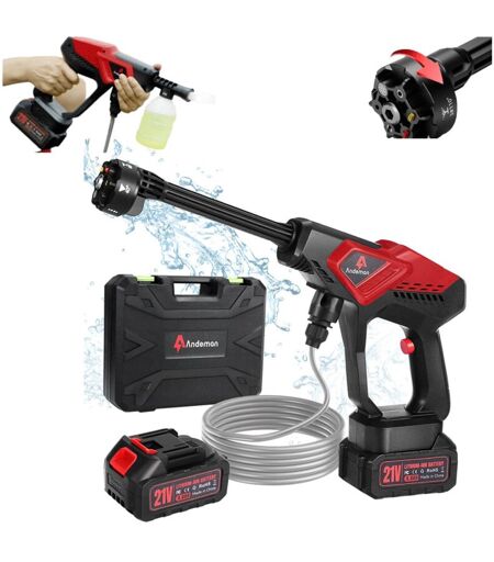 Description Nettoyeur haute pression sans fil, 21 V, 180 bar/3000 psi, portable, avec 2 batteries de 3 Ah, buse réglable 6 en 1, tuyau de 5 m, pour le nettoyage et l'arrosage de la voiture, du sol et du jardin. À propos de cet article : ✅【Nettoyeur haute pression 180 bar/3000 psi】 Le pistolet à eau électrique offre une pression de travail maximale de 180 bar/3000 psi avec une entrée d'eau maximale de 4,5 MPa, capable de pulvériser jusqu'à 270 l/h, pour un nettoyage rapide des taches tenaces. Conçu pour le lavage de voitures, allées, murs, sols, piscines, vitres et pour le nettoyage des animaux. ✅【Buse 6 en 1】Nettoyeur haute pression sans fil équipé d'une buse 6 en 1, il peut être utilisé en modes 0°, 15°, 25°, 40°, 0° Douche et Jet, répondant ainsi à tous les besoins de nettoyage en extérieur. Il permet d'arroser les plantes, de nettoyer les murs, les sols, les salles de bains, les allées, les clôtures et les recoins difficiles d'accès, aussi bien à la maison qu'au jardin. ✅【Prise ...