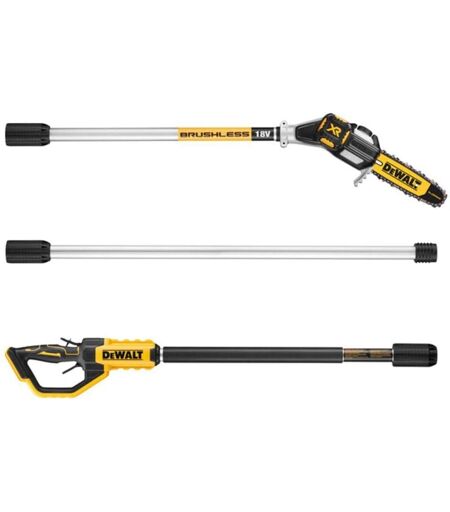 Tronçonneuse sans fil 18V Le guide de 20 cm réduit les rebonds et la chaîne à lubrification automatique assure une coupe en douceur. avec chaîne de l'Oregon moteur Brushless puissant Poignée extensible jusqu'à 3 m de long permettant de couper jusqu'à 4,5 m de haut sangle supplémentaire pour une meilleure stabilité de la scie lors des travaux en hauteur L'inclinaison de la tête permet de mieux contrôler la position lors de la coupe des branches. surface d'appui dentée, offrant un excellent support pour la scie en hauteur des supports métalliques et un crochet pour les arbres - arrêt ferme de la scie pendant la coupe et retrait facile des branches coupées Vitesse de coupe: 6,5 m/s longueur de la poignée basique/étendue : 2/3 m espace de travail : 4,5 m poids avec les piles : 4,3 kg compatible avec les batteries DeWALT 18 V Batterie et chargeur non inclus. ...