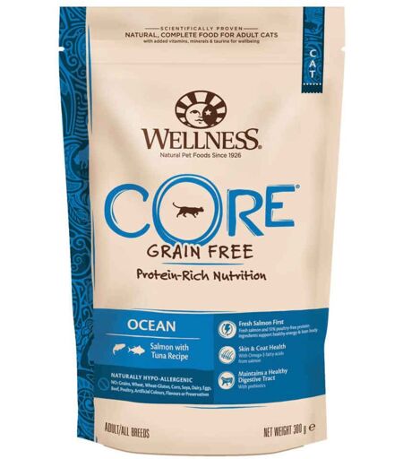 Les croquettes Wellness CORE Océan Saumon et Thon sont complètes et équilibrées pour les chats adultes. Leur composition se rapproche du régime alimentaire naturel des chats : elles sont sans céréales, riches en protéines, pauvres en glucides et elles contiennent du poisson frais. Les croquettes Wellness CORE Océan Saumon et Thon contiennent du saumon frais en premier ingrédient. Elles sont aussi composées d'acides gras oméga-3 provenant du saumon bénéfiques pour la peau et le pelage ainsi que de prébiotiques qui favorisent une bonne digestion. Cet aliment est pauvre en allergènes : il ne contient pas de céréales, de blé, de gluten de blé, de maïs, de soja, de produits laitiers, d'¿ufs et de b¿uf. Il est également sans colorants, arômes et conservateurs artificiels. ...