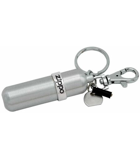 Genuine Zippo Fuel Canister Take along an extra refill of Zippo premium lighter fluid. The reusable personal-sized aluminium canister holds enough fuel to fill one Zippo lighter (around 10ml). Includes a swivel snap fastener, a split rings for keys, a disk to tighten and loosen the flint screw, and a rubber storage sleeve for two extra Zippo flints."" ...