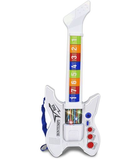 Guitare électronique Rock avec fonction infrarouge. 8 touches / notes de couleur, effets lumineux, 3 sons, 8 rythmes avec arrangements, 8 chansons préenregistrées lisibles au toucher des cordes lumineuses, 3 accords déclenchables au toucher. Port pour casque micro (non fourni). Arrêt automatique. Avec une bandoulière. Fonctionne avec 3 piles AA (non fournies). ...