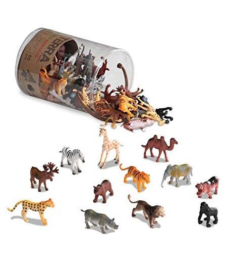 Youll go wild for these 60 amazing miniature animals from Terra by Battat This tube of wild animal toys includes lots of tiny cool figurines like cheetahs Moose zebras Giraffes bears rhinos Lions tigers camels elephants hippos & gorillas Small animal figurines are collectable fun and ideal educational toys for kids learning about science and the environment Each tiny animal figure measures approximately 1-2 5 inches x 1 5-2 5 inches long so theyre also a perfect cake topper or goody bag stuffer for a safari animal-themed kids party Start your miniature zoo animal toy collection with this wild animals in tube playset from Terra by Battat ...