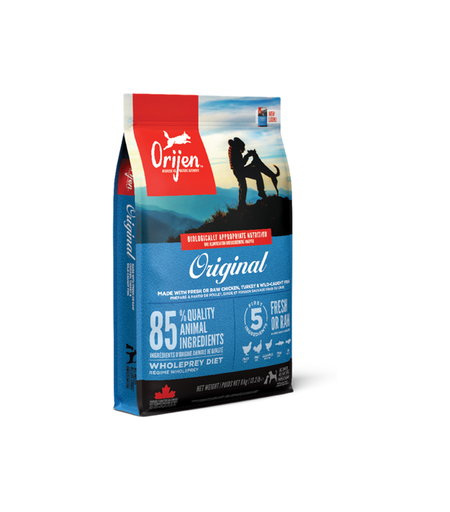 Les croquettes ORIJEN original dog* (pour les chiens adultes de toutes races) sont conçues pour répondre aux besoins physiologiques de votre chien. Une recette à base de viandes et de poissons sauvages pour assurer un apport quotidien riche en protéines et un plein épanouissement à votre animal de compagnie. Cette recette de nourriture sèche est parfaitement adaptée aux chiens de toutes races et de tous âges. Sa formule nourrissante prend soin de la santé de votre compagnon. Quels sont Les 3 bienfaits majeurs des croquettes ORIJEN ORIGINAL DOG ? Fraicheur des produits et grande variété de viandes La nourriture ORIJEN original dog propose une grande diversité de viandes fraîches qui assurent l'épanouissement et la bonne santé de votre chien. Le régime naturel de votre chien est composé de protéines et de viandes « proie » entières c'est pourquoi ORIJEN utilise la viande en totalité. Richesse en protéine animale La recette ORIJEN original dog est composée de 85 % de viande, 2/3 de viande fraiche ou crue et 1/3 de viande lentement déshydratée. La totalité des portions de viandes provient d'animaux certifiés propres à la consommation humaine avant leur inclusion dans les nourritures ORIJEN. Faible teneur en glucide Réalisées sans céréales, cette recette de croquette est idéale pour les digestions difficiles. ORIJEN original dog est parfaitement approprié au régime alimentaire naturel de votre chien et contient peu de glucides seulement 20% qui sont des glucides à faible indice glycémique. Très goûteuse, la nourriture sèche ORIJEN original dog saura séduire votre chien et transformera ses repas en moment de pur plaisir grâce à des saveurs naturelles. ORIJEN est un dérivé du mot latin « origo » qui signifie la source ou le commencement. ORIJEN s'est donc inspiré des origines de l'alimentation canine pour produite la meilleure nourriture pour votre animal de compagnie. Le concept « biologically appropriate » consiste à offrir à votre animal la fraîcheur, la diversité, la quantité et la qualité des viandes et poissons dont votre chien a besoin physiologiquement. Ces recettes ne contiennent aucun additif synthétique ni aucun ingrédient ne faisant pas partie du régime naturel des chiots. ...