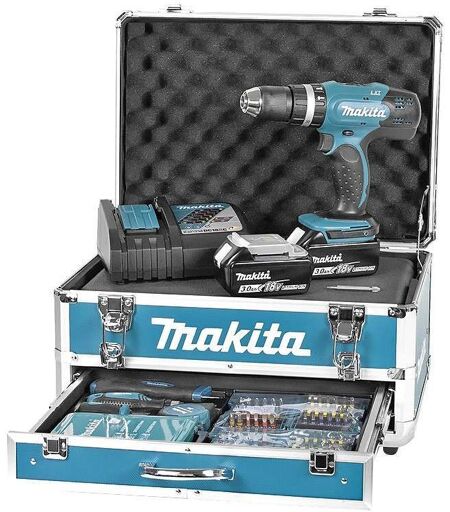 AVANTAGES DE LA VISSEUSE PERCEUSE À PERCUSSION MAKITA ; Visseuse/perceuse à percussion sans fil universelle, parfaite pour les travaux mi-lourds. Batteries ultra légères grâce à la technologie révolutionnaire Li-ion. Boîte deux vitesses à engrenages entièrement métalliques garantissant fiabilité et efficacité lors des travaux de perçage aussi bien que de vissage. Munie d'un mandrin automatique monobague solide 13mm et d'un verrouillage automatique de l?arbre pour un échange facile des forets. Réglage précis du couple en 16 positions plus position de perçage permettant de contrôler facilement la profondeur d'enfoncement. Gâchette à variateur de vitesse pour une amorce facile de la vis. Plus de contrôle grâce au frein électrique arrêtant la machine dès qu'on lâche l'interrupteur. Poignée ergonomique s?amincissant vers le bas et revêtue de caoutchouc. Livrée en boîte à outils en aluminium, avec un tiroir contenant quelques outils à main et 96 outils de perçage/vissage Livrée avec deux batteries Li-ion puissantes 3,0Ah, à protection électronique contre la surcharge, la surchauffe et les décharges profondes et aux contacts auto-nettoyants assurant un transfert optimal du courant. Le chargeur performant détermine une trajectoire de charge individuelle en fonction de la condition de la batterie, assurant la pleine charge (3.0Ah) en 22 minutes seulement. CARACTERISTIQUES TECHNIQUES Plage de réglage du couple 1 - 4 Nm Composition chimique batterie Li-ion Tension de batterie nominale 18 V Capacité de batterie 3,0 Ah Temps de charge en moyenne 22 min Nombre de batteries fournies 2 Régime à vide 1ière vitesse 0-400 t.p.m. Régime à vide maximal 0-1300 t.p.m. Cadence de frappe 1ière vitesse 0-6000 min-1 Cadence de frappe maximale 0-19500 min-1 Couple de calage 38 Nm Couple max. (serrage progressif) 27 Nm Couple max. (serrage franc) 42 Nm Diamètre maximal dans l'acier 13 mm Diamètre maximal dans le bois 36 mm Capacité du mandrin 1,5 - 13 mm Dimensions (Lo x La x H) 239 x 79 x 227 mm Poids avec batterie fournie (EPTA) 1,7 kg ACCESSOIRES 2 batteries Li-ion BL1830 1 chargeur rapide DC18RC 1 mandrin automatique 1/2" 1,5-13mm 1 embout double 1 Coffret en Aluminium avec 96 accessoires de perçage/vissage ...