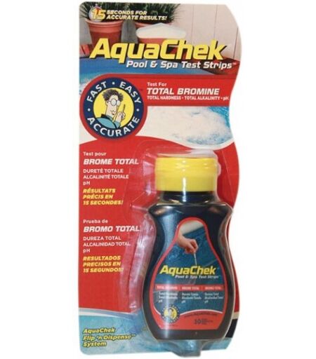 Présentation des bandelettes de Test Aquachek rouge 50 bandelettes test permettant de contrôler le pH, le brome totale, l'alcalinité totale et la dureté totale de votre eau de piscine. Ces bandes sont idéales pour les personnes utilisant le brome comme désinfectant pour leur bassin.. Obtenez 4 résultats de test importants en une fois ! Il suffit de tremper une bande AquaChek rouge dans l'eau de votre piscine ou de votre spa pendant une seconde et retirez-la immédiatement. Pour que l'eau de la piscine reste propre et saine, testez la une à deux fois par semaine. Si vous testez un spa, nous vous recommandons de faire le test avant et après chaque utilisation. ...