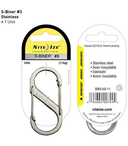 Nite Ize S-Biner Stainless Steel Carabina All the Usefulness of a Single-Gated Carabiner... Times Two! Our unique, two-in-one S-Biner offers functionality for a nearly endless variety of uses. Made of high quality, weather-resistant stainless steel, this ultra-handy accessory with its dual spring gates will hold, secure, and connect everything from house keys and cell phones to technical camping gear. Attach valuables to the center bar for ultimate security, link gate ends to a second set of items and anchor, or connect many items together. Smaller-sized S-Biners are excellent for connecting two zipper sliders on backpacks, duffels, and suitcases. We know that one size doesn't fit all, so we've designed five different sizes so you can choose the right size for the task at hand. We've found that the smaller sizes work great for hanging smaller items from a purse or backpack strap, attaching to individual keys, or hanging a plant from a ceiling hook. The larger sizes work great for bigger jobs like hanging a paint can from a ladder or a tool to your tool belt. But, the list goes on and on. We think Backpacker Magazine said it best when they wrote ""Don't ask yourself if you need this useful little widget. The question is: how many?"" High quality stainless steel construction Available in 5 sizes / 3 finishes Secure stainless steel wire gate closure Size #1 dimensions: 1.56"" x .56"" weight rating: 5 lb. Size #2 dimensions: 2"" x .88"" weight rating: 10 lb. Size #3 dimensions: 2.63"" x 1.13"" weight rating: 25 lb. Size #4 dimensions: 3.5"" x 1.5"" weight rating: 75 lb. Size #5 dimensions: 4.38"" x 1.94"" weight rating: 100 lb. Warning: Not for use where disengagement could result in bodily injury or property damage. Not for climbing. FAQ From what type of stainless steel are the S-Biners made? The S-Biner is constructed from 2Cr13 Stainless steel for the body and 202 Stainless steel for the wire gates. How wide are the gate openings for each size? Size #1= .24"" (6.2mm) Size #2= .35"" (9.1mm) Size #3= .52"" (13.2mm) Size #4= .72"" (18.3mm) Size #5= .88"" (22.5mm) How much weight can the S-Biner hold? Size #1: 5 lb. Size #2: 10 lb. Size #3: 25 lb. Size #4: 75 lb. Size #5: 100 lb. Please select required S-Biner Stainless Steel options. ...
