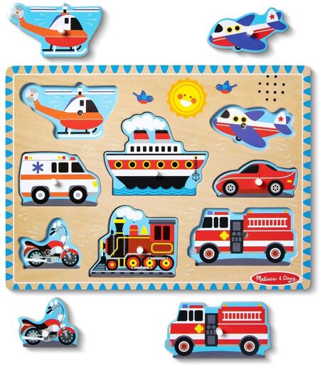 Ce puzzle sonore pour enfant comporte des images détaillées de 8 véhicules ou moyens de transport. Chaque forme émet le son du véhicule quand la pièce est correctement placée sur le puzzle. Les petits adorent ! Ce puzzle d'encastrement musical comporte 8 pièces. Un jouet musical en bois de la fameuse marque américaine Melissa and Doug. Nécessite 2 pil ...
