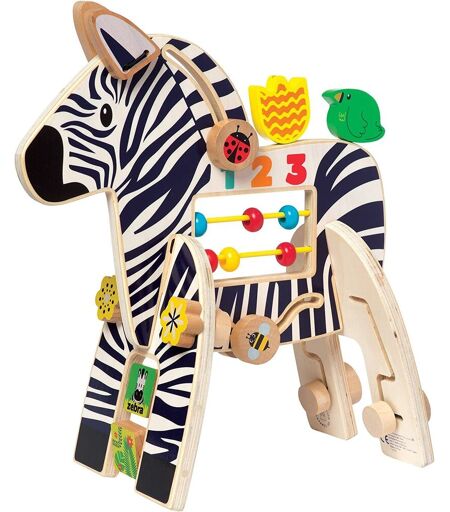 Ce jouet d'activité en bois Zèbre Safari se compose de 3 pièces qui s'emboîtent parfaitement et sont remplies de choses amusantes à toucher et à explorer. L'enfant va pouvoir découvrir de nombreuses activités ludiques comme des engrenages qui tournent, des formes élastiques, un boulier, des panneaux rotatifs ou encore des labyrinthes. Ce jouet d'éveil de 33 cm de haut est ...