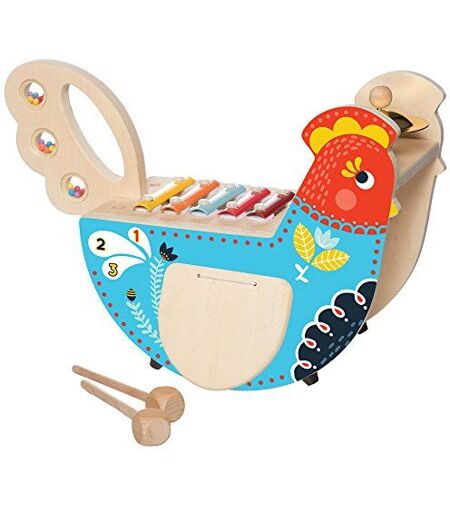 All the kids will be clucking about it The musical chicken is loaded with plenty of auditory and visual fun for kiddos 12 months and up Instinctively, youngsters will want to begin exercising his or her hand-eye coordination to produce noise. Musical instrument toy includes 1 cymbal, 5-bar xylophone, 1 maraca tail, 2 clacking wings that double as drums and detachable wooden mallets on the back. The tail feathers of this wood chicken can be removed and double as a maraca. This playful wood activity toy is great for introducing little ones to music and for fostering motor development and auditory stimulation. Since 1979, Manhattan Toy has been making award-winning, high quality, educational toys for your baby, toddler or kid. From baby toys and toddler toys to wooden toys and activity centers, our goal is to provide the safest and best toys available. All of our products, from the newest concepts to our time-tested classics, are innovatively designed to inspire imaginative play and are routinely safety tested to pass strict CPSC, ASTM, EN71 and health Canada safety standards. ...