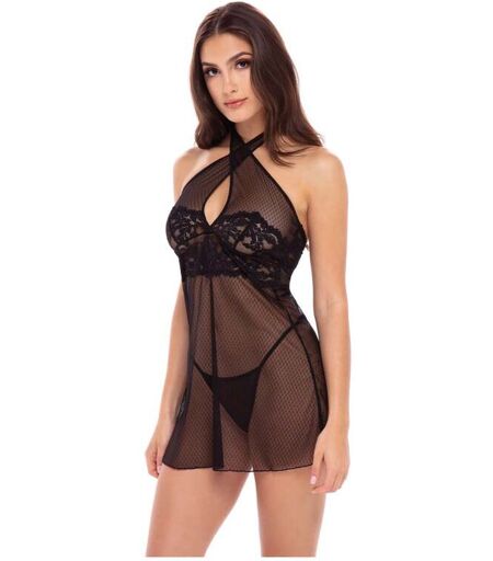 Enfilez cette sublime Nuisette Col Croisé Résille & Dentelle Noire de la marque René Rofé, et devenez instantanément une femme fatale ! Cette nuisette est entièrement en résille noire à motifs en diamants pour un look ultra-sexy ! Elle allie à la perfection dentelle florale et transparence dans le but de rendre fou d'excitation votre partenaire. La forme courte et assez fluide fera rapidement grimper la température. Le col croisé qui se noue au cœur de votre cou par deux lanières satinées laissant vos épaules et votre dos nu mettra en valeur votre poitrine et ajoutera une touche de sensualité. Le décolleté mis en avant par une ouverture en trou de serrure sera surmonté par de la fine dentelle faisant le tour de votre buste et se réglera par des agrafes dans le dos. Sa transparence épousant vos formes vous rendra irrésistible. Le string ficelle assorti noir est fourni. Composition : 90% Nylon, 10% Elasthanne Tailles S/M, M/L. ...