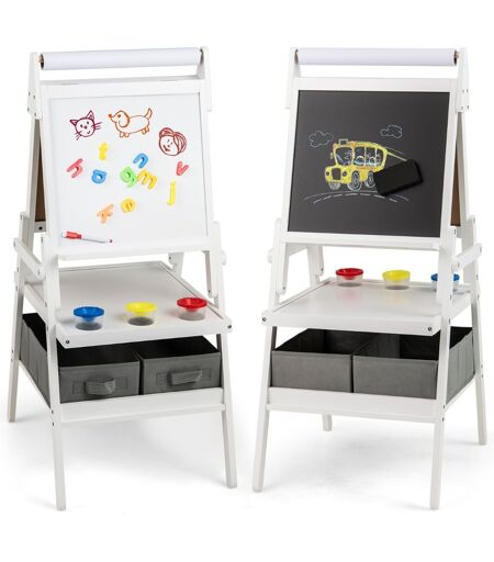 CostwayChevalet 3-en-1 Chevalet Debout Double Face avec Tableau Noir et Tableau Blanc Rouleau de Papier pour 3-6 Ans Blanc