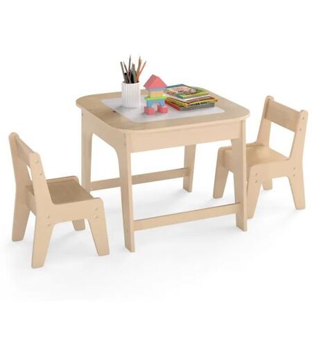 Costway Table Et 2 Chaises Enfants 3-6 Ans - Plateau 2 Face : Noir Et Blanc - Dessin Effaçable- Espace De Rangement Caché - Naturel