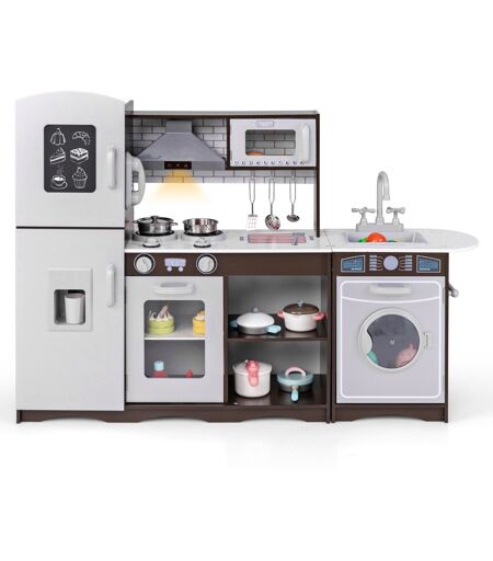 Notre cuisine de jeu d'angle a l'apparence d'une vraie cuisine moderne avec ses ustensiles de cuisine de taille enfant. Elle dispose de plusieurs zones de jeu, dont un four, un réfrigérateur, un micro-ondes, une cuisinière, un évier, un téléphone, un tableau noir et une machine à laver à double porte pour un nettoyage ludique. Les lumières et les sons de la hotte, les boutons à clic, les robinets rotatifs et la machine à glaçons utilisable apportent une véritable expérience de cuisine. Fabriqué en bois robuste sans danger pour les enfants, cet ensemble de jeu promet une sécurité durable. Attributs : 【cuisine moderne】Notre ensemble de cuisine pour enfants est conçu pour ressembler à une vraie cuisine moderne, avec un ensemble d'ustensiles de taille enfant, dont une poêle à frire, une marmite, une passoire, une cuillère et une spatule. Grâce à sa conception séparable peu encombrante pour des configurations libres, l'ensemble de jeu s'intègre naturellement dans les coins de la chambre des enfants ou de votre salon. 【jeu de rôle interactif】Pour inciter vos enfants à cuisiner de manière imaginative, l'ensemble de cuisine comporte une série de détails amusants et réalistes. Les boutons rotatifs produisent des clics audibles, la hotte aspirante est dotée d'effets lumineux et sonores, et la machine à glaçons distribue des glaçons jouets. De plus, le téléphone et le tableau noir utilisable facilitent le jeu de rôle en tant que petit propriétaire de restaurant. 【grand espace de rangement】En plus d'être des espaces de jeu, la machine à glaçons, le four, le micro-ondes, la machine à laver et le réfrigérateur servent également d'armoires de rangement, complétées par 2 étagères ouvertes et des crochets pour ustensiles de cuisine. Vos tout-petits apprendront à ranger leurs jouets et à garder leur aire de jeu bien rangée, favorisant ainsi des habitudes bénéfiques. 【sûr et de qualité】Fabriqué en bois durable avec une peinture sans danger pour les enfants, cet ensemble de cuisine certifié présente une construction robuste pour préserver le bien-être de votre tout-petit. Les trous et les fentes d'aération empêchent les accidents et offrent aux parents une tranquillité d'esprit. 【cadeau parfait pour les enfants】Cet ensemble de jouets de cuisine factice est non seulement amusant, mais aussi un cadeau éducatif pour toutes les occasions spéciales, favorisant les capacités cognitives, la motricité fine et la créativité des enfants. Les tout-petits de plus de 3 ans peuvent s'amuser ensemble ou interagir avec leurs parents, en apprenant les concepts de base de la cuisine tout en perfectionnant leurs compétences en communication. Caractéristiques : Ensemble de jeu de cuisine moderne avec des motifs réalistes comme de vrais appareils de cuisine Fabriquée avec des matériaux sans danger pour les enfants Conception de type divisé pour plus d'options d'agencement dans les coins de la pièce Interactif avec de la lumière et du son pour un plaisir réaliste Machine à glaçons... ...