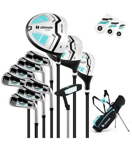 >Ensemble complet incluant 3 bois, 7 fers, un putter et 3 housses >Sac à support avec housse de pluie zippée >Driver #1 avec grande zone de frappe et aide à l¿alignement >Facile à contrôler grâce au bas centre de gravité >Putter maillet améliorant stabilité et précision à chaque putt >Shafts et poignées antidérapantes de haute qualité >Tous les bois et fers avec shafts en graphite >Putter équipé d¿un shaft en acier >5 diviseurs supérieurs et 5 poches zippées >Rangement pratique avec crochet pour serviette et support pour gant >Poche étanche pour objets de valeur >3 poignées supérieures et une poignée de transport souple >Support robuste à déploiement rapide avec base escamotable ...