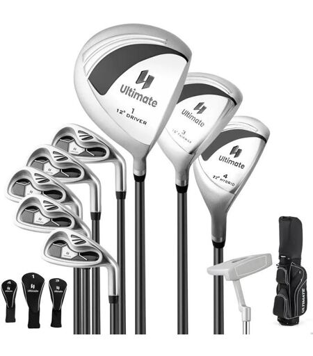 Matériau des Clubs de Golf: Aluminium, Zinc, Métal, Fibre de Carbone, TPR Matériau du Sac de Golf: Polyester Hauteur du Sac de Golf (avec Capuche de Pluie): 126 cm Hauteur du Sac de Golf (sans Capuche de Pluie): 89 cm Dimensions de la Base: 24,5 cm x 24,5 cm (L x l) 3 bois, 5 fers, 1 putter et 1 sac de golf Putter et 5 fers avec viseurs 11 compartiments sur le dessus du sac de golf 6 poches de rangement zippées et un porte-parapluie pratique Manches en graphite et poignées confortables en TPR 3 couvre-clubs pour une protection optimale ...