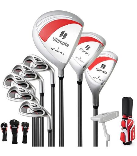 Matériau des Clubs de Golf: Aluminium, Zinc, Métal, Fibre de Carbone, TPR Matériau du Sac de Golf: Polyester Hauteur du Sac de Golf (avec Capuche de Pluie): 126 cm Hauteur du Sac de Golf (sans Capuche de Pluie): 89 cm Dimensions de la Base: 24,5 cm x 24,5 cm (L x l) 3 bois, 5 fers, 1 putter et 1 sac de golf Putter et 5 fers avec viseurs 11 compartiments sur le dessus du sac de golf 6 poches de rangement zippées et un porte-parapluie pratique Manches en graphite et poignées confortables en TPR 3 couvre-clubs pour une protection optimale ...