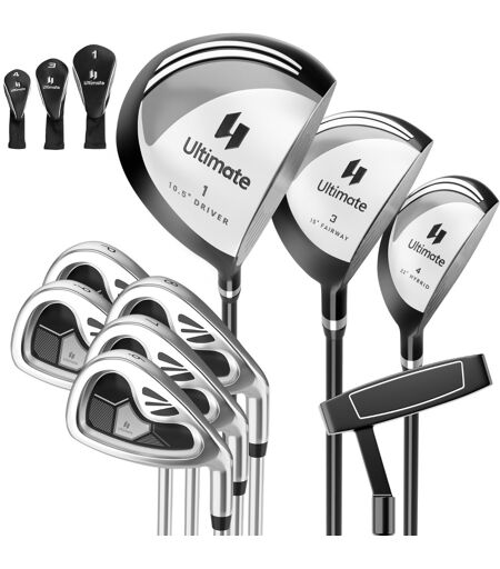Cet ensemble de clubs de golf de 9 pièces pour homme droitier comprend un Driver 1# avec couvre-tête, un Fairway 3# avec couvre-tête, un Hybride 4# avec couvre-tête, un fer 6#, un fer 7#, un fer 8#, un fer 9#, un fer P# et un Putter. Les clubs de golf sont conçus avec un centre de gravité bas pour un lancement plus haut et plus rapide. Le large sweet spot permet plus de tolérance sur les coups décentrés. Le putter est équipé d'un alignement visuel pour maintenir les putts en ligne. Avec des manches en carbone et des poignées en TPR, cet ensemble vous offrira une expérience confortable. Attributs:【Ensemble complet de clubs de golf pour femmes】Cet ensemble de clubs de golf de 9 pièces comprend un Driver 1# avec couvre-tête, un Fairway 3# avec couvre-tête, un Hybride 4# avec couvre-tête, un fer 6#, un fer 7#, un fer 8#, un fer 9#. fer, fer P# et un Putter. Il est spécialement conçu pour les golfeurs droitiers. Remarque : le sac de golf n'est pas inclus. 【Bois Driver en alliage d'aluminium à 10,5°】Avec un poids supplémentaire placé dans les zones du talon et de la pointe, ce Driver en alliage d'aluminium présente un centre de gravité bas qui empêche la rotation inverse. Et la surface de frappe haute résistance est conçue pour une distance de tir plus longue. Et le sweet spot élargi conduit à plus de tolérance. 【Fers 6# & 7# & 8# & 9# & P# avec tête en alliage de zinc】Les rainures profondes sur la surface de frappe améliorent la friction pour un meilleur contrôle et une meilleure rotation. Et le dos concave est conçu pour moins de poids et une meilleure absorption des chocs. Le centre de gravité bas facilite le lancement des balles et un grand sweet spot améliore la tolérance sur les coups décentrés. 【Putter maillet avec alignement visuel】Le putter maillet est conçu avec une aide à l'alignement facile à utiliser qui vous aide à frapper la balle de manière plus stable et plus précise. Et la surface antidérapante permet un mouvement fluide qui maintient les putts en ligne. 【Manche et poignée de haute qualité】Les bois sont équipés de tiges en carbone et de poignées TPR souples et antidérapantes, ultra légères, de haute résistance et faciles à contrôler. Ainsi, cet ensemble de clubs de golf vous offrira une expérience de golf confortable. Caractéristiques: Répond à la plupart des besoins des débutants avec cet ensemble de clubs de golf de 9 pièces Livré avec 3 couvre-golfs pour protéger les bois Utilise un manche en carbone ultra léger Équipé de poignées TPR souples pour une expérience de golf confortable Conçu avec un centre de gravité bas pour un lancement plus haut Fournit plus de tolérance avec un sweet spot élargi Dispose d'un alignement visuel sur le putter pour une meilleure précision Plus attrayant avec un design élégant et accrocheur ...