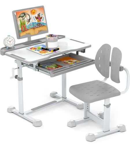 CostwayEnsemble de Bureau et Chaise pour Enfant Bureau d'Étude Réglable en Hauteur avec Plateau Inclinable Support de Livre Gris