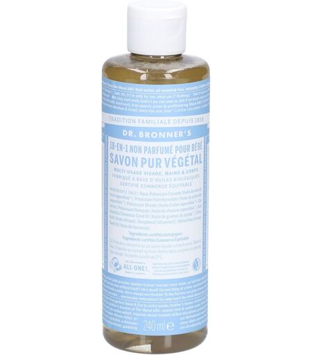 Un savon liquide naturel efficace, sans additif–pour un nettoyage pur. Ce savon liquide non parfumé pour bébé de Dr. Bronner’s ne contient aucune substance odorante etest un savon idéal pour les enfants, tout comme pour les personnes ayant une peau sensible ou souffrant d’allergies. Les savons ne contiennent aucun agent moussant, épaississant ou de conservateur. Ils moussent uniquement grâce à la combinaison exceptionnelle d’ingrédients naturels, qui provient d’une expérience forte de 150 ans. Aussi bon pour le corps que pour l’environnement, avec Dr. Bronner‘s vous avez la possibilité de contribuer chaque jour au bien être de la planèteBénéficesIngrédients 100% naturelsCertifié commerce équitableIssu d'une agriculture biologique contrôlée100% biodégradableEmballage 100% recycléIndicationSavonApplicationDéposer 2 à 3 gouttes dans le creux de la main, faire mousser légèrement, savourer la mousse veloutée, enfin rincer abondamment. Pour obtenir un complément de bain parfumé, ajouter deux cuillères à soupe dans la baignoire. Au contact de l’eau chaude, les huiles essentielles naturelles déploient encore plus leurs arômes bienfaisants. Attention à toujours bien refermer les savons liquides, l’ouverture peut s’obstruer.IngrédientsAqua, Potassium Cocoate (huile de coco saponifiée*‡), Potassium Palm Kernelate (huile de palmiste saponifiée*‡), Potassium Olivate (huile d’olive saponifiée*‡), Glycerin*, Potassium Hempate (huile de chanvre saponifiée*), Simmondsia Chinensis Seed Oil (huile de jojoba saponifiée*), Citric Acid (acide citrique), Tocopherol (vitamine E)* Ingrédients certifiés biologiques ‡ Ingrédients certifiés Commerce Équitable ...