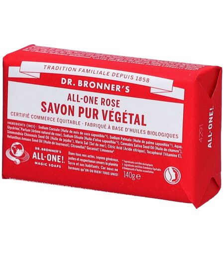 Savon naturel solide à base d’huiles végétales, aux senteurs suaves de rose. Le savon à la rose dégage une atmosphère élégante et romantique grâce au mélange délicat d’huiles essentielles naturelles. Les savons ne contiennent aucun agent moussant, épaississant ou de conservateur. Ils moussent uniquement grâce à la combinaison exceptionnelle d’ingrédients naturels, qui provient d’une expérience forte de 150 ans. Aussi bon pour le corps que pour l’environnement, avec Dr. Bronner‘s vous avez la possibilité de contribuer chaque jour au bien être de la planète.BénéficesIngrédients 100% naturelsCertifié commerce équitableIssu d'une agriculture biologique contrôlée100% biodégradableEmballage 100% recycléIndicationSavon naturel solide à base d’huiles végétalesApplicationFaire mousser délicatement à l’aide d’un peu d‘eau et répartir équitablement sur le corps (éviter les yeux). Grâce à l’huile de noix de coco de haute qualité, on obtient une mousse soyeuse naturellement et l’huile biologique de jojoba réduit l’assèchement de la peau grâce à ses propriétés soignantes. Ce savon nettoie en douceur et laisse derrière lui le parfum naturel des huiles essentielles. Facile à emporter, il peut même être utilisé dans un lac lors d’une randonnée. Il est aussi bien adapté pour les mains que pour le visage et le corps et est 100% biodégradable. La peau ne recevra que ce qui peut aussi être rejeté dans la nature.IngrédientsSodium Cocoate (huile de coco saponifiée*‡), Sodium Palmate (huile de palme saponifiée*‡), Aqua, Glycerin*, Parfum (arôme naturel de roses), Sodium Olivate (huile d’olive saponifiée*‡), Cannabis Sativa Seed Oil (huile de chanvre saponifiée*), Simmondsia Chinensis Seed Oil (huile de jojoba saponifiée*), Sodium Chloride (sel de mer), Citric Acid (acide citrique), Tocopherol (vitamine E), Citral◊, Limonene◊, Linalool◊* Ingrédients certifiés biologiques ‡ Ingrédients certifiés Commerce Équitable ◊ composants d'huiles essentielles ...