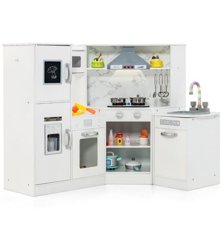 CostwayJeu de Cuisine d'Angle en Bois Évier Séparé Sons et Lumières Micro-ondes Machine à Glaçons et Lave-vaisselle Simulés Tableau Blanc