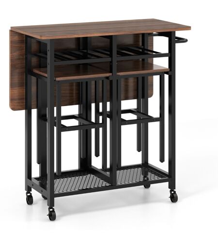 CostwayTable à Manger Extensible 3 Pièces Roulante avec Porte-bouteilles de Vin de 6 Places et Poignée Latérale Table de Petit-déjeuner Pliable Marron Rustique