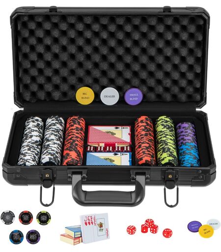Ce jeu de jetons de poker est composé de 300 pièces, 2 jeux de cartes, 5 dés et 3 jetons de croupier, contenant tout ce dont vous avez besoin pour une soirée de jeu passionnante. Chaque jeton se compose de 3 couches : une couche de film, une couche composite et une couche de fer, garantissant un poids et un toucher parfaits, tout comme de vrais jetons de casino. L'ensemble comprend également une mallette de transport robuste avec une clé et son intérieur est doublé. L'ensemble de jetons de poker est idéal pour 7 à 9 personnes pour se divertir et passer un bon moment en famille ou entre amis ! Attributs : 【Ensemble complet de jetons de poker】300 jetons, 2 jeux de cartes, 5 dés et 3 jetons de croupier sont tous dans un boîtier équipé d'une clé. Ainsi, cet ensemble de jetons de poker sera parfait pour que 7 à 9 passionnés de poker puissent profiter du jeu ensemble. 【Jetons standard de 14 grammes】Tous les jetons avec noyau de fer à double injection présentent un toucher doux et un poids bien équilibré qui est de 14 g comme de vrais jetons de casino. Et les jeux de jetons possèdent 6 couleurs différentes pour des dénominations variées: 100 blancs, 100 orange, 50 verts, 25 bleus et 25 violets. 【Cartes à jouer de haute qualité】Le jeu de jetons de poker est également livré avec 2 jeux de cartes à jouer de niveau casino. Chaque carte est composée à 100 % de plastique et recouvert de mat, imperméable et durable pour une utilisation à long terme. 【Mallette pratique】Avec une coque extérieure en aluminium bien conçue et une doublure intérieure en PU antichoc, la mallette offrira une protection attentionnée au jeu. L'espace intérieur est bien divisé en zone de stockage de dés et de cartes, ainsi qu'en emplacements pour jetons pour un ajustement personnalisé. De plus, la mallette comporte également une boucle de verrouillage fonctionnelle et une grande poignée. 【Choix divertissant parfait】Toutes les pièces de cet ensemble de jetons de poker sont fabriquées avec une qualité casino, et vous pouvez l'utiliser pour jouer au Texas Hold’em, au Blackjack, etc... Ce jeu de jetons sera également un bon choix pour les tournois ou les rassemblements entre amis. Caractéristiques : Ensemble complet pour les passionnés de poker, parfait pour les réunions Jetons standard de 14 g pour une sensation et un poids authentiques de casino Cartes à jouer de haute qualité pour une durabilité et une imperméabilité supérieures Mallette pratique avec serrure sécurisée et compartiments de rangement divisés La coque en aluminium robuste et l'intérieur doublé offrent une protection réfléchie Poignée confortable pour un transport facile Polyvalent pour jouer à divers jeux de cartes populaires Qualité de qualité casino pour un usage professionnel et domestique Comprend tous les accessoires nécessaires pour une expérience de poker complète Idéal pour les tournois ou les jeux occasionnels entre amis et en famille ...