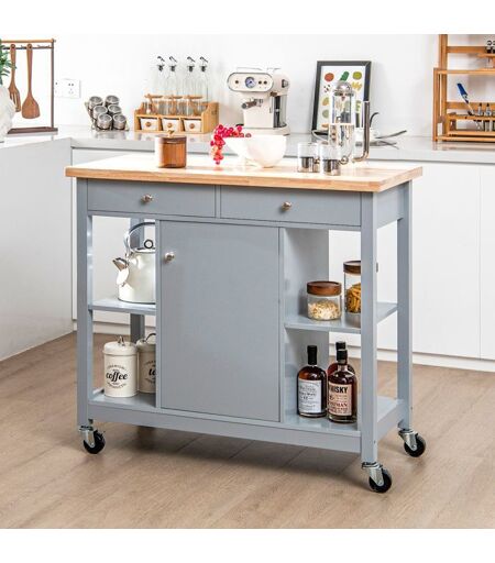 Costway Desserte De Cuisine Mobile, Plateau En Bois Hévéa, Ilot De Cuisine, 4 Etagères Ouvertes, 2 Tiroirs, Chariot De Service Gris