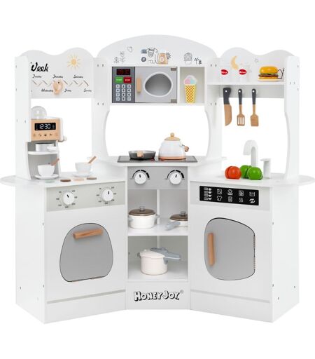 Notre cuisine de jeu d'angle en bois dispose d’un micro-ondes et de cuisinières dotés de lumières et de sons authentiques, tandis que les boutons rotatifs peuvent émettre des sons de « clic ». Avec tous les accessoires nécessaires, la machine à café offre l'expérience de préparer une tasse de café. Les enfants peuvent également jouer le robinet, l'évier, le four et la machine à laver, profitant d'heures de jeu de rôle incroyables. Avec des rangements, des bords arrondis et une surface sans échardes, c’est un cadeau parfait pour les tout-petits de +3 ans. Attributs : 【préparez une tasse de café】La cuisine de jeu d'angle comprend une machine à café simulée livrée avec des accessoires de café. Cela permet aux enfants de profiter du plaisir de faire semblant de préparer une tasse de café. ① Choisissez une saveur. ② Moudre les grains de café. ③ Tournez le filtre. ④ Savourez votre café. 【lumières et sons amusants】Le micro-ondes et les cuisinières de cet ensemble de cuisine jouet sont conçus avec des lumières et des sons réalistes, ce qui améliore considérablement le plaisir du jeu. En même temps, tous les boutons sont rotatifs et émettent des sons de « clic » pour offrir aux enfants une véritable expérience de cuisine. 【choix de jeu variés】Avec un joli bloc coulissant, les enfants peuvent le déplacer sur pour exercer leur coordination œil-main. De plus, l'évier et le robinet, le four et la machine à laver peuvent offrir aux enfants plus d'options de jeu, faisant de cette cuisine de jeu de simulation un jouet complet pour les enfants. 【solution de rangement idéale】La cuisine d'angle en bois dispose d'étagères ouvertes, de crochets de suspension et de compartiments ouverts pour ranger les accessoires et autres articles, encourageant les compétences d'organisation dès le plus jeune âge. De plus, la cuisine de jeu en bois peut parfaitement s'intégrer dans un angle de la chambre. 【cadeau parfait pour les enfants】Dotée d'une surface sans échardes et de bords arrondis, cette cuisine de jeu d'angle crée un environnement de jeu sûr pour les tout-petits. Elle est conforme à des normes élevées de fiabilité accrue, servant de cadeau fiable pour les garçons et les filles âgés de 3 ans et plus. Caractéristiques : Micro-ondes et cuisinières lumineuses avec des sons pour plus de plaisir Boutons rotatifs avec des sons de « clic » pour améliorer le temps de jeu Machine à café équipée d'accessoires pour faire semblant de jouer Plus d'espaces de jeu avec un évier, un four et une machine à laver Les accessoires de cuisine offrent une expérience de jeu de rôle immersive Espace de rangement suffisant pour les jouets, les collations, les livres et les accessoires Sécurisée pour les enfants avec des bords arrondis et une base stable Les poignées pratiques facilitent l'ouverture des portes Fermez fermement les portes avec un loquet de porte magnétique et des charnières métalliques robustes Merveilleux cadeau pour les enfants de plus de 3 ans Assemblage requis ...
