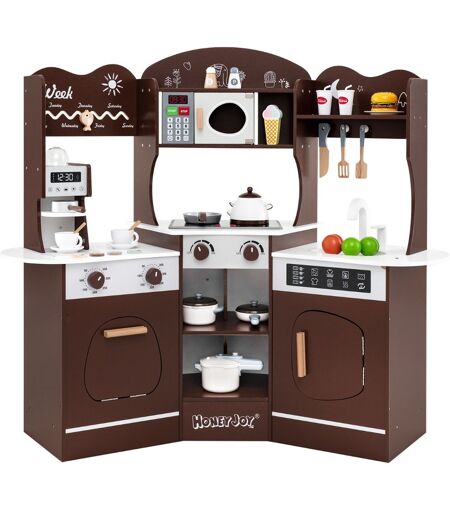 CostwayCuisine de Jeu d'Angle en Bois avec Lumières et Sons Machine à Café Micro-Ondes Four Machine à Laver pour 3+ ans Marron