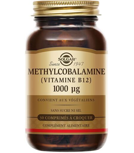 Complément alimentaire à utiliser dans le cadre d’une alimentation variée, équilibrée et d’un mode de vie sain.Fatigué ? B12 à croquer !Grâce à ses nombreux rôles : au sein du système nerveux, du système immunitaire, dans le métabolisme de l'énergie, la formation des globules rouges, etc..., la vitamine B12 contribue à réduire la fatigue.A privilégier aussi en combinaison avec le Gentle Iron, fer doux de Solgar, pour la formation des globules rouges, notamment chez les végétariens et les végétaliens.Prendre 1 comprimé par jour sous la langue ou à croquer.IngrédientsÉlaboré avec ces ingrédients : mannitol, sels de magnésium d’acide gras, acides gras, dioxyde de silicium, arôme naturel de cerise, carboxyméthylcellulose de sodium réticulée/gomme de cellulose réticulée.Valeurs nutritionnellesChaque comprimé fournit :Agent de charge : mannitolAnti-agglomérants : sels de magnésium d’acide gras, acides gras, dioxyde de siliciumVitamine B12.....1000 μg ........ 40000%AR*(Méthylcobalamine)Arôme naturel de ceriseCarboxyméthylcellulose de sodium réticulée/ gomme de cellulose réticulée*AR = Apports de RéférenceConseils d'utilisationPour adulte, un (1) comprimé par jour, à placer sous la langue ou à croquer, de préférence au moment des repas. Respecter la dose recommandée.Précautions d'emploiConserver à température ambiante. Ne pas utiliser si l’opercule du flacon est manquant ou endommagé. A consommer de préférence avant fin et lot N° voir sur le haut du flacon.Pour les femmes enceintes ou allaitantes, prendre l’avis d’un professionnel de santé. Tenir hors de portée des enfants. Ne pas dépasser la dose journalière.Les compléments alimentaires ne peuvent être utilisés comme substituts d’un régime alimentaire varié et équilibré et d’un mode de vie sain.Poids netFlacon de 30 comprimés à croquerAdresse du FabricantSolgar Vitamins14 rue de Berlin77144 MontévrainFrance ...